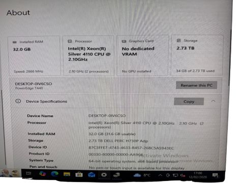 Pre-owned Dell PowerEdge T440 Tower Server with 2x Intel Xeon Silver 4110 2.10GHz CPUs, 32GB RAM, PERC H730P RAID controller, 3TB HDD Storage, Windows 10 (Not activated) (S/N: 3H28FV2).