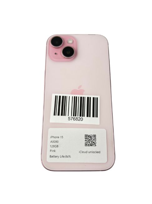 Pre-owned Apple iPhone 15 (A3090) 128GB in Pink (iCloud account unlocked) (Battery health: 84%).
