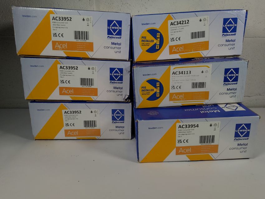 Six as new assorted Lewden consumer units 100A main switch 8 9 14 outgoing ways.