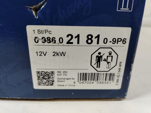 A remanufactured Bosch starter motor 12v 2kW for possible Ford Transit fitment model unknown, sealed box (0986021810-9P6).