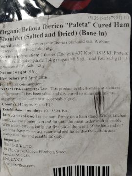 A shoulder of Organic Bellota Iberico Paleta cured ham (salted and dried, bone in).