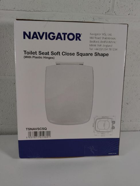 Five Navigator square shape white toilet seats with plastic hinges (one box unsealed).