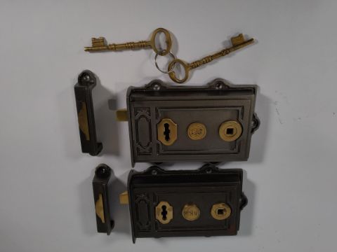 Two pre-owned cast iron and brass Davenport Rim locks and two keys.