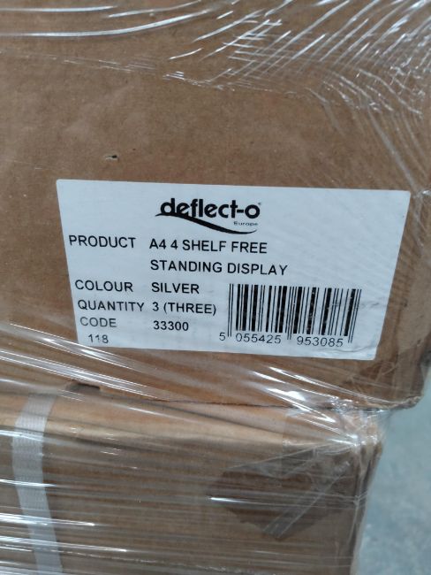 A pallet containing Deflecto, A4 4 Shelf Free Standing Display, (33300).