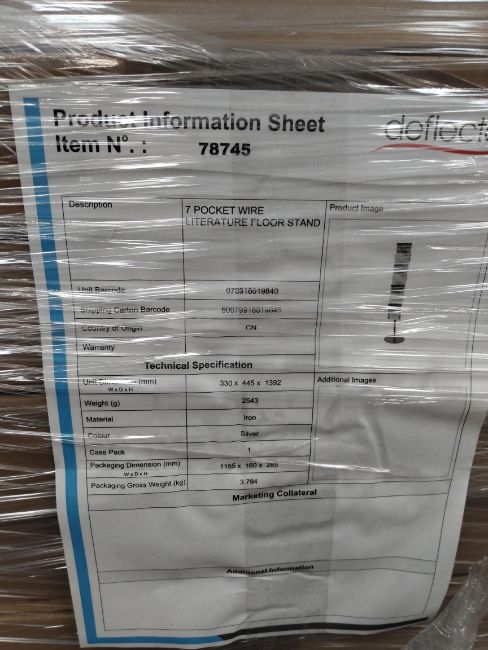 A pallet containing Deflecto, 7 Pocket Wire Literature Floor Stand, (78745).