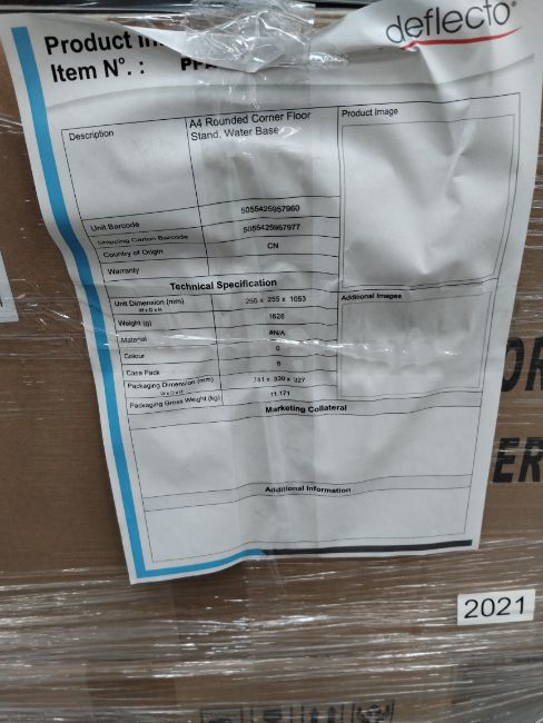 A pallet containing Deflecto, A3 Round Corner Floor Stands Water Base, (PPA3WBS).