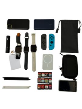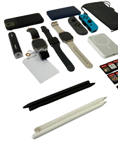 Assorted pre-owned items including Nintendo Switch game cards, Apple Watch Series 3 (iCloud unlocked), power banks, Apple Pencils, MP3 Player, Apple Watch Ultra (iCLoud locked, sold for parts) and others (All items sold as seen).