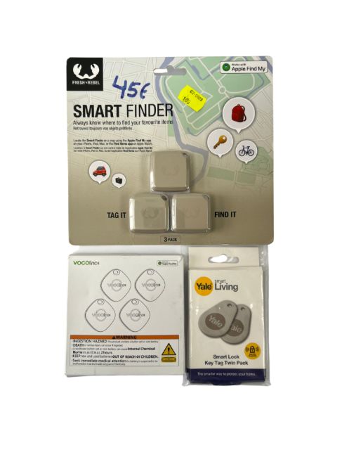 As new Fresh'N Rebel Smart Finder 3 Pack, Vocolinc Vos Tag VT2201 4 pack in black (Box open), Yale Smart Living Smart Lock Key Tag Twin Pack.