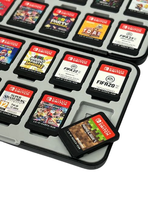 Assorted pre-owned Nintendo Switch games including Super Smash Bros, Minecraft, and Fifa 23.