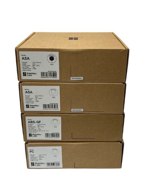 Four as new 1kg Spools of Bambu Lab 1.75mm Filament; 1 x Black ASA, 1 x White ASA, 1 x White ABS-GF & 1 x White PC.