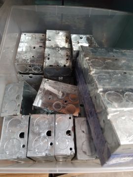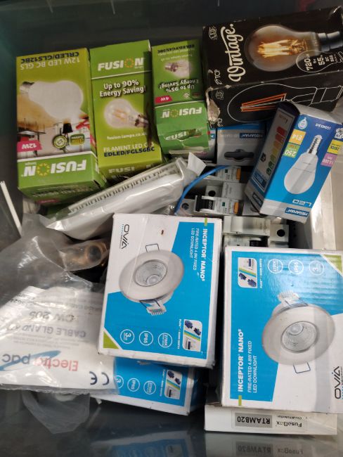 A shelf of assorted electrical related items to include Seaward portable appliance tester, Hager sockets, Appleby dry lining boxes and a Niglon stock, dies and guides set.