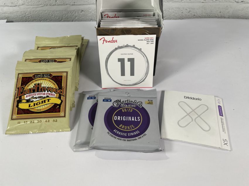 Twenty sets of assorted guitar strings to include Ernie Ball Earthwood acoustic 11-52 and Fender electric 11-49.