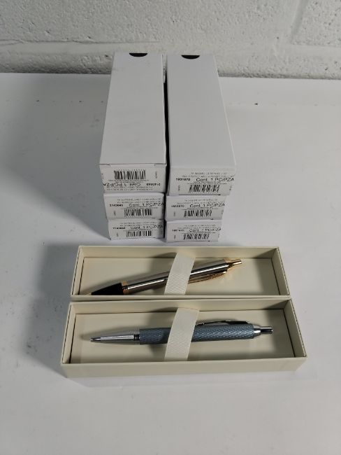 Six as new Parker Ballpoint pens to include 3x IM Premium Blue Grey CT Ballpoint Pen (2143645) and 3x IM Brushed Metal GT Ballpoint Pen (1931670).
