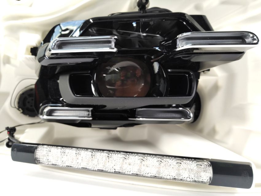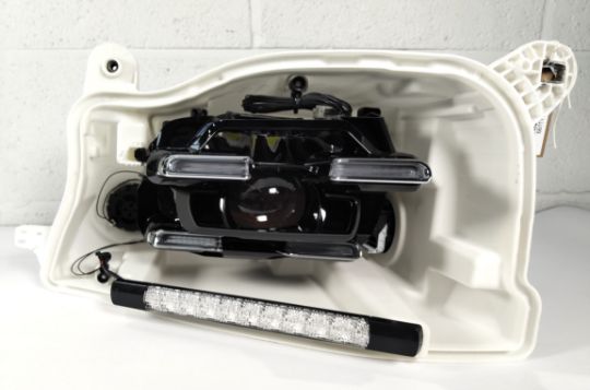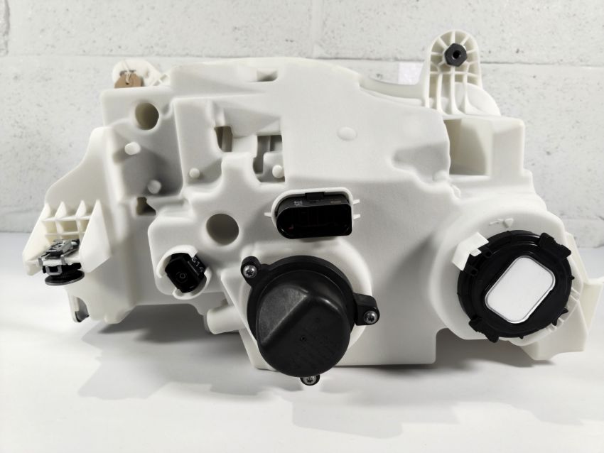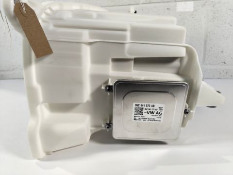 A pre-owned left Hella headlight case and inner unit with power module, unknown fitment, possibly for Audi/VW/Porsche model, slight damage to bracket (95C941572AB).