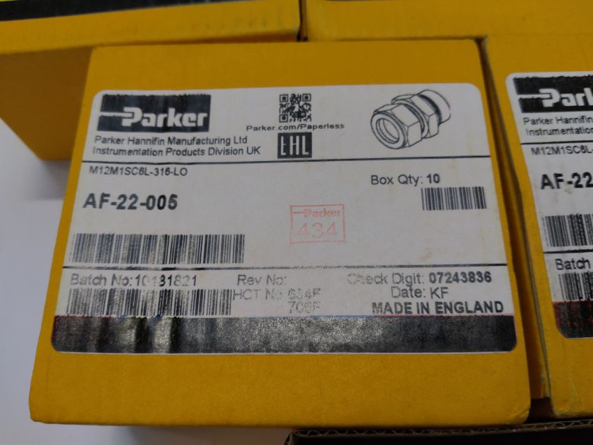 Six as new boxes of Parker Hafflin tube pipe fittings M15M1SC6L-316-LO AF-22-005. Pack size 10 per box.