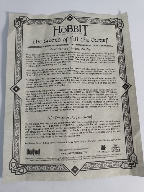 The Hobbit reproduction The sword of Fili the Dwarf with certificate and wall mount by United Cutlery (0ver 18s only).