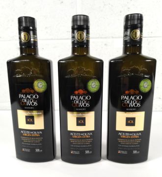 Three Palacio de Los Olivos extra virgin, international award winner olive oils, cold pressed, picual variety, 500ml bottles, produced in Spain (best before 01/2027).
