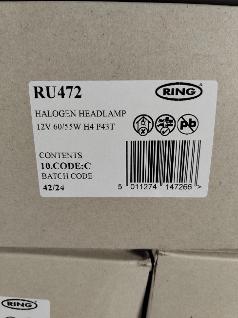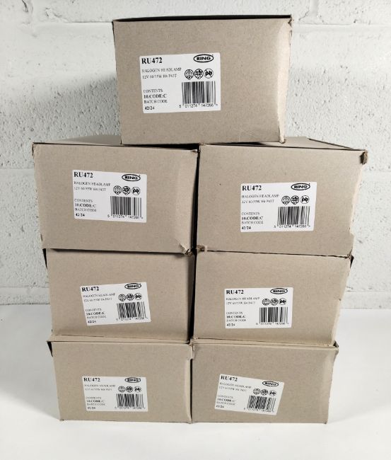 Seven packs of as new Ring Automotive halogen headlamp 60/55w P43t H4 Carded Bulbs. Ten bulbs units per pack (70 bulb units in total) (RU472).