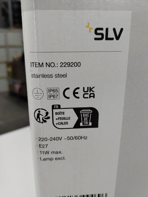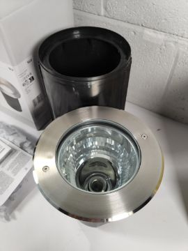Two SLV Dasar outdoor round lighting stainless steel E27 uplight 11W IP67, boxes opened.