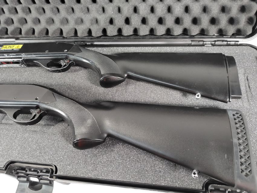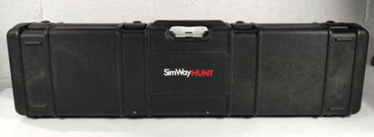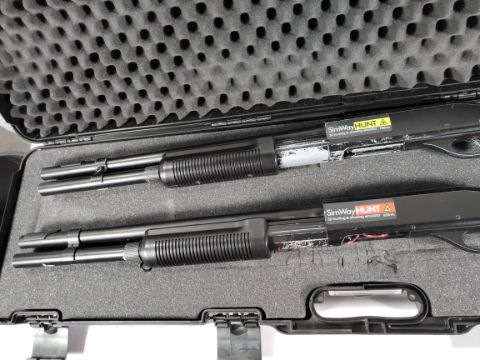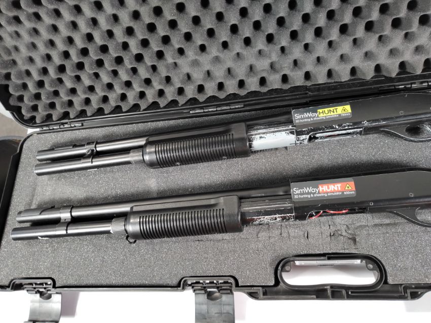Two pre-owned Simway 3D Hunt simulator pump action shotgun (replicas) with 780/850 nm technology, some marks and missing broken parts with hard case.