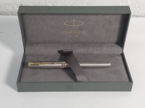 An as new Parker sonnet fountain pen in silver with gold trim (REF: 1934505/3501179315058).