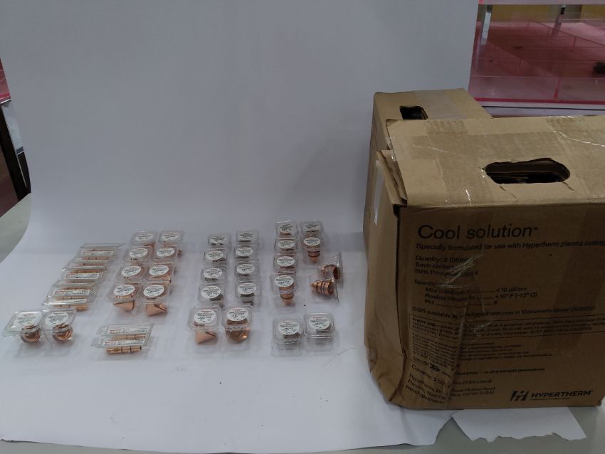 As new selection of Hypertherm components and four containers of cool solution, 420231 420233 420234 420237 420242 420249 420252 420255.