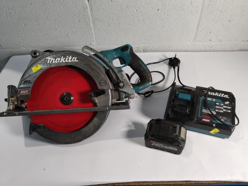 A pre-owned Makita RS002G circular saw with 2 x 40v batteries and charger.