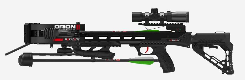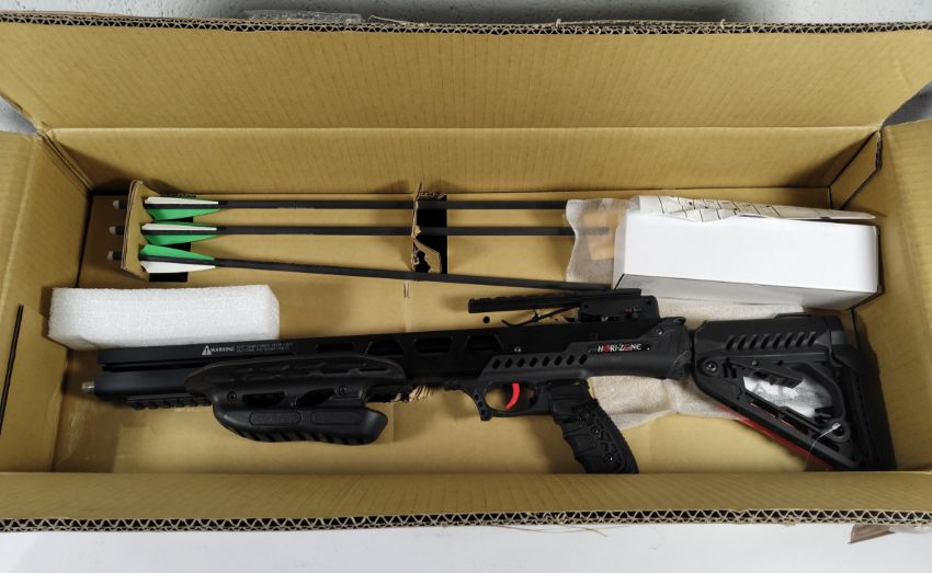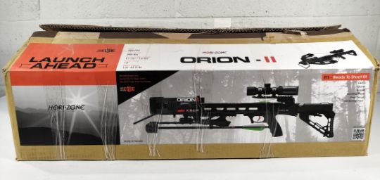 A Hori-Zone Orion II compound crossbow with scope, speed 400fps, draw weight 205lbs, 15" power stroke. Box opened (stock image) (over 18s only).