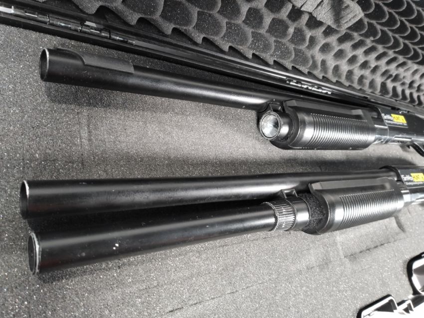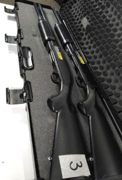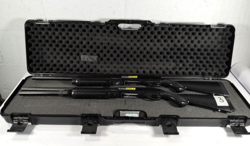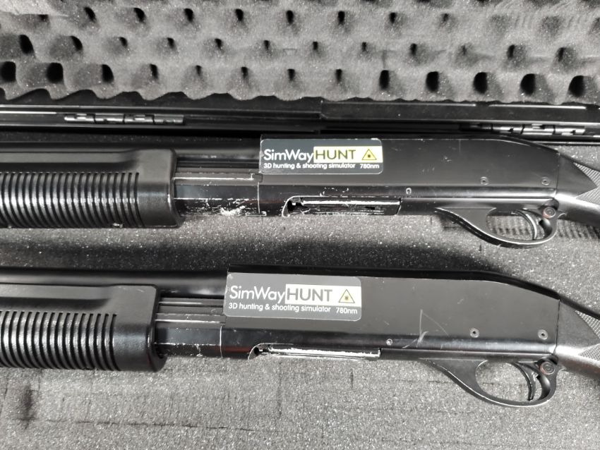 Two pre-owned Simway 3D Hunt simulator pump action shotgun (replicas) with 780/780 nm technology, some marks and missing broken parts with hard case.