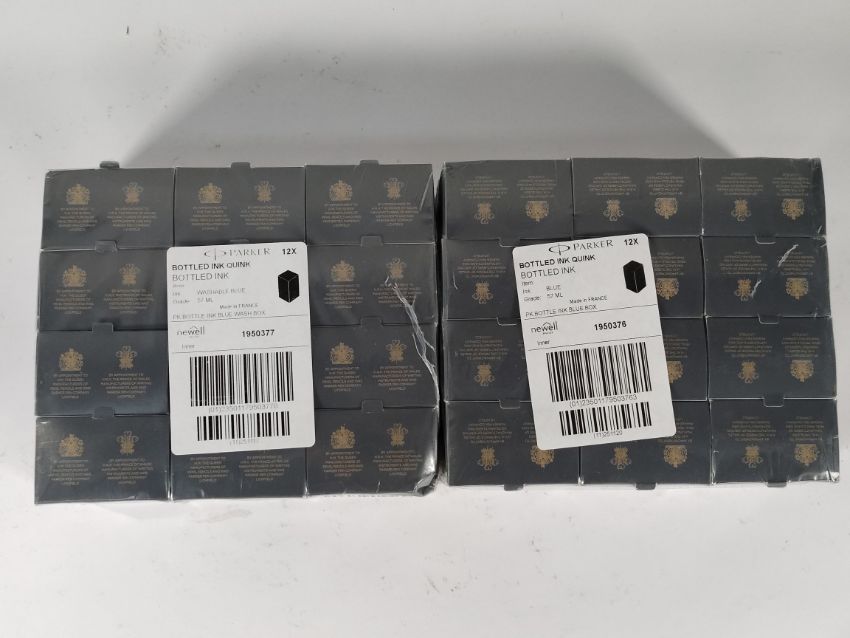 Twenty four as new Parker Bottled Ink Quinks to include 12x Blue Ink (1950376) and 12x Blue Washable Ink (1950377).