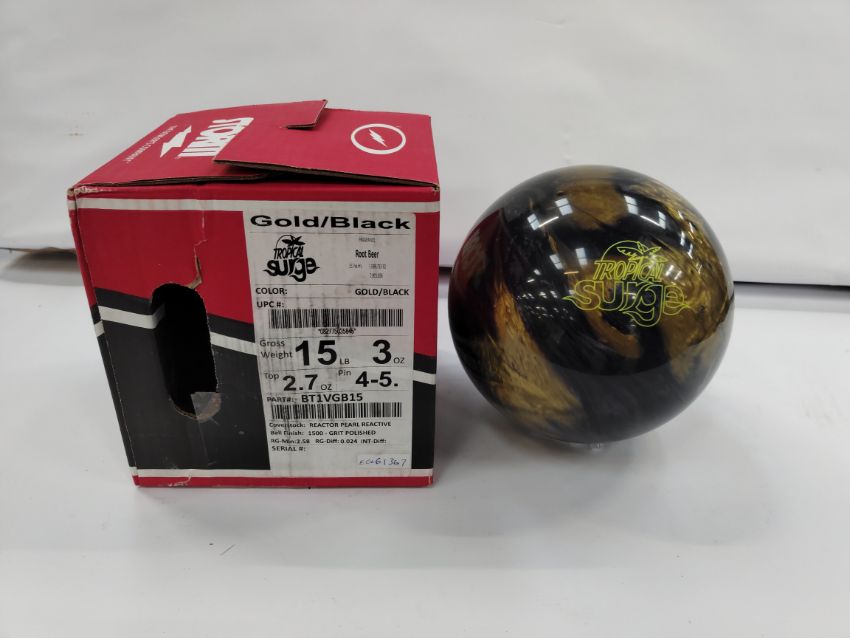 As new Strom Tropical Surge Bowling Ball, 15lb, 3oz, Top 2.7oz, Pin 4-5", Gold/Black, fragrance: Root Beer (PN: BT1VGB15) (finger holes not drilled in).