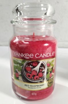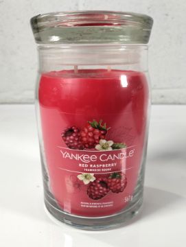 Four as new Yankee candles; two red raspberry 623g single wicks, one capri glow 567g double wick and one red raspberry 567g double wick.