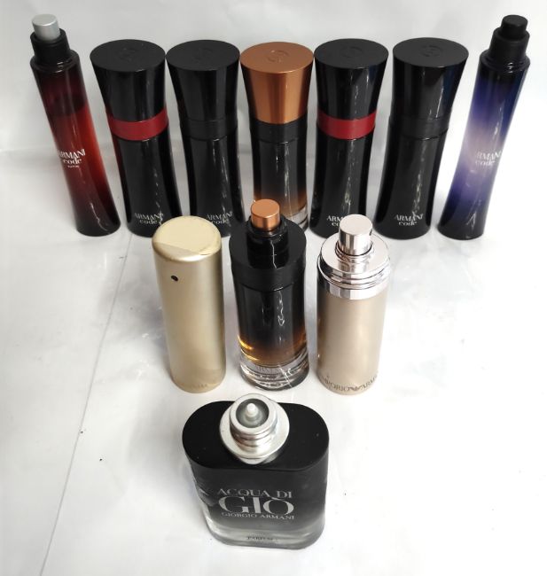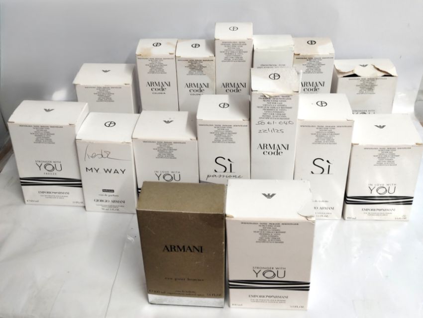 Thirty seven Armani perfumes/testers and related (please note: bottles may have been used/packaging may have damage/missing spray tops or lids).