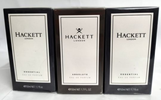 Three as new Hackett London 50ml EDP fragrances, two essential and one absolute, sealed boxes.
