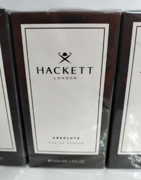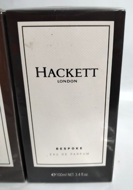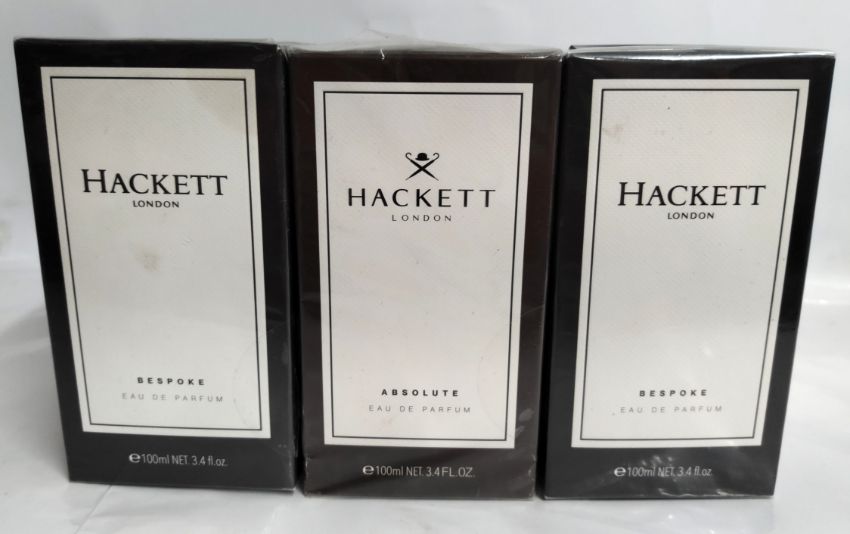 Three as new Hackett London 100ml EDP fragrances- two bespoke and one absolute, sealed boxes.
