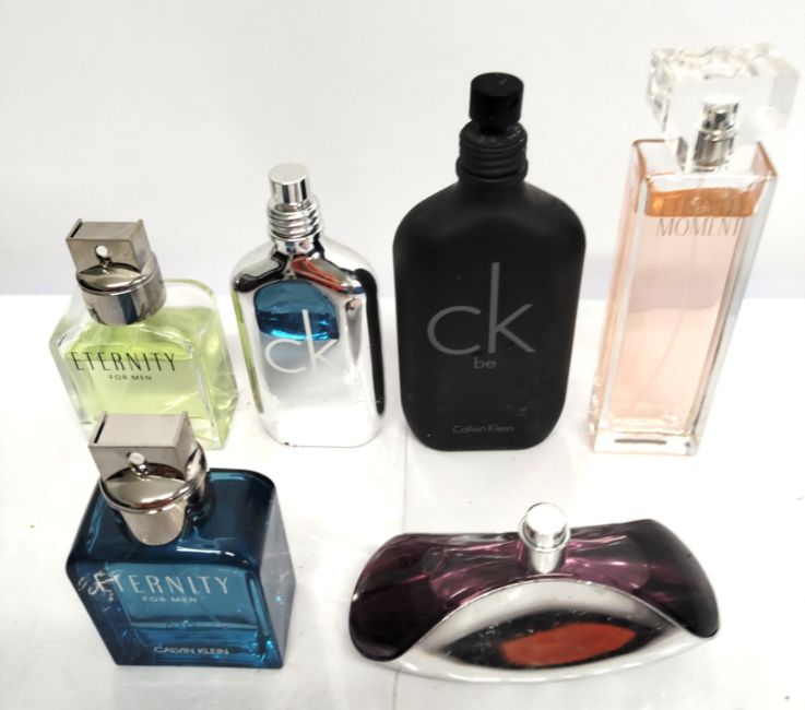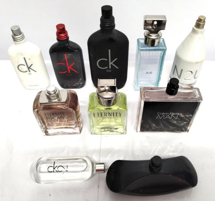 Thirty Calvin Klein perfumes/testers and related (please note: bottles may have been used/packaging may have damage/missing spray tops or lids).