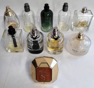 Fifty six perfumes/testers and related to include Paco Rabanne, Givenchy, Boss, Dior and Marc Jacobs (please note: bottles have been used/packaging may have damage/missing spray tops or lids).