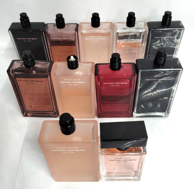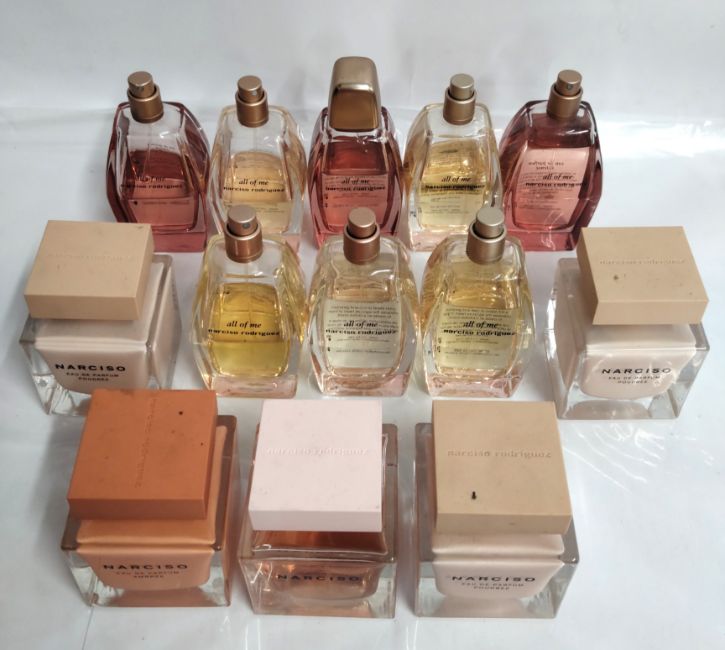 Thirty eight Narciso Rodriguez perfumes/testers and related (please note: bottles may have been used/packaging may have damage/missing spray tops or lids).