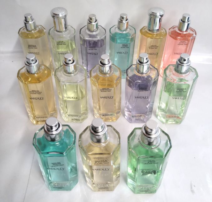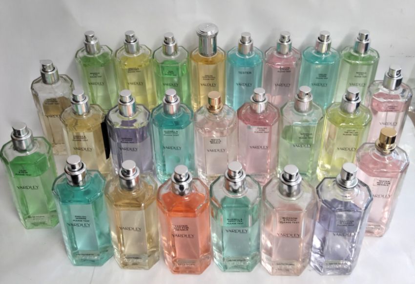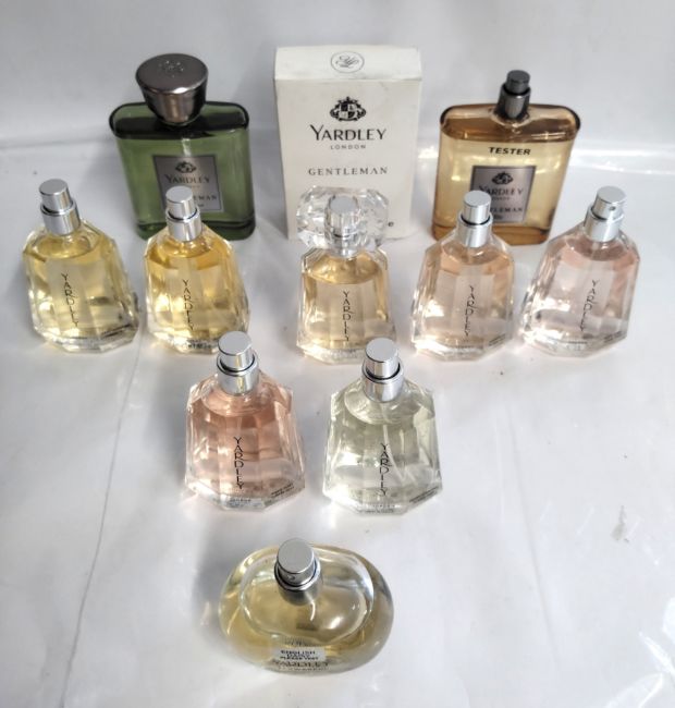 Fifty Yardley perfumes/testers and related (please note: bottles may have been used/packaging may have damage/missing spray tops or lids).