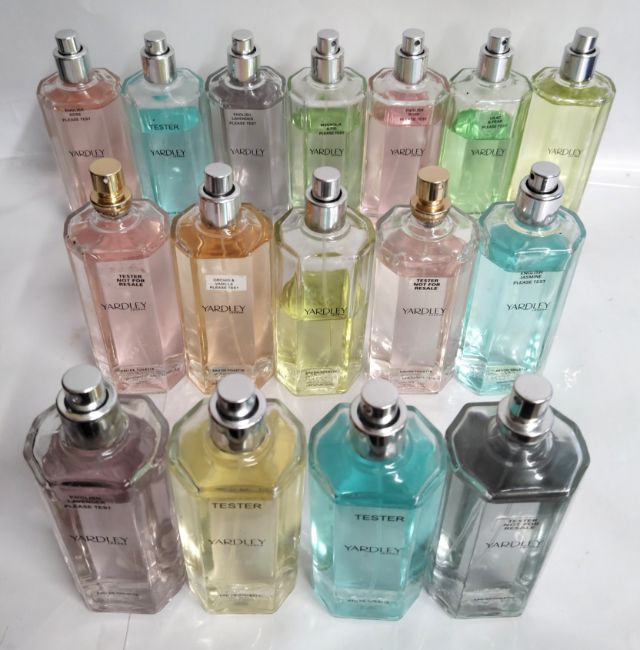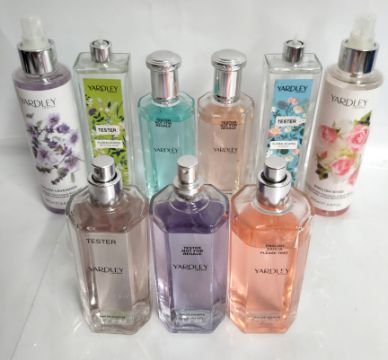 Fifty five Yardley perfumes/testers and related (please note: bottles may have been used/packaging may have damage/missing spray tops or lids).