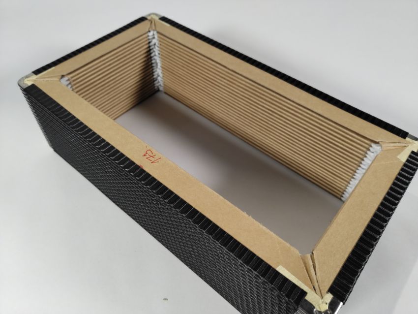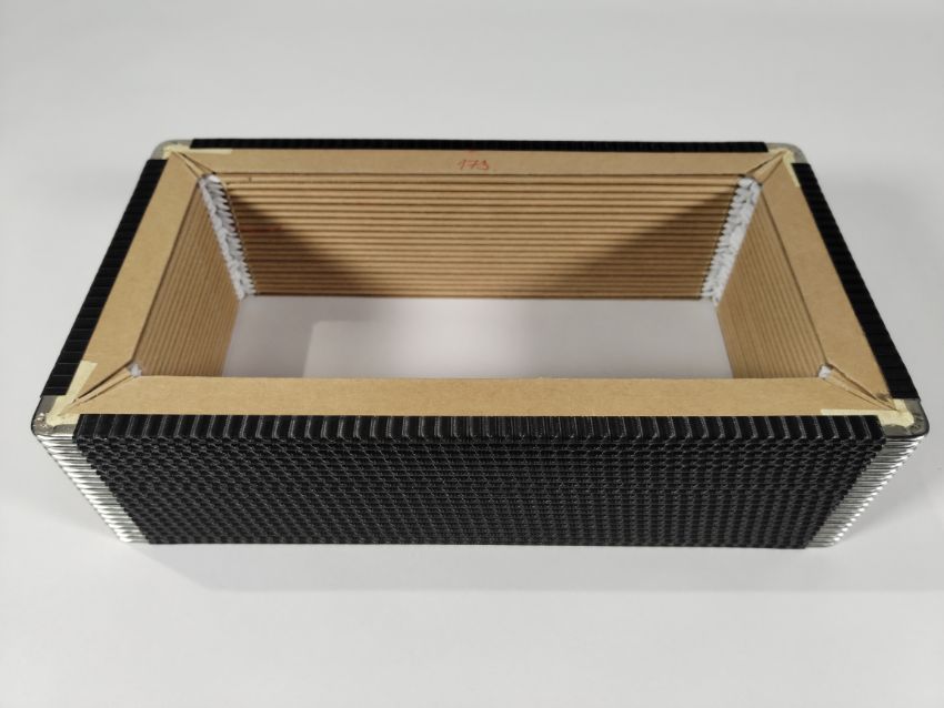 Two Harmonikas Bellows x 20 folds, light leather corner, inside P11 red cloth, outside K14 black striped, R6 for an Aerophone instrument, 155 x 280 x 25mm.