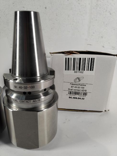 Two Weldon BT 40-32-100 milling cutter holders, dual contact AD/B, box opened (DC.406.04.32).